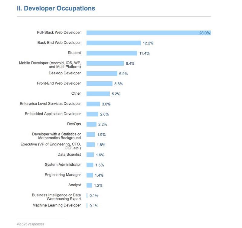 在StackOverflow的调查中,有近一半的开发者的岗位都是Web开发,移动开发岗只占了8%。
