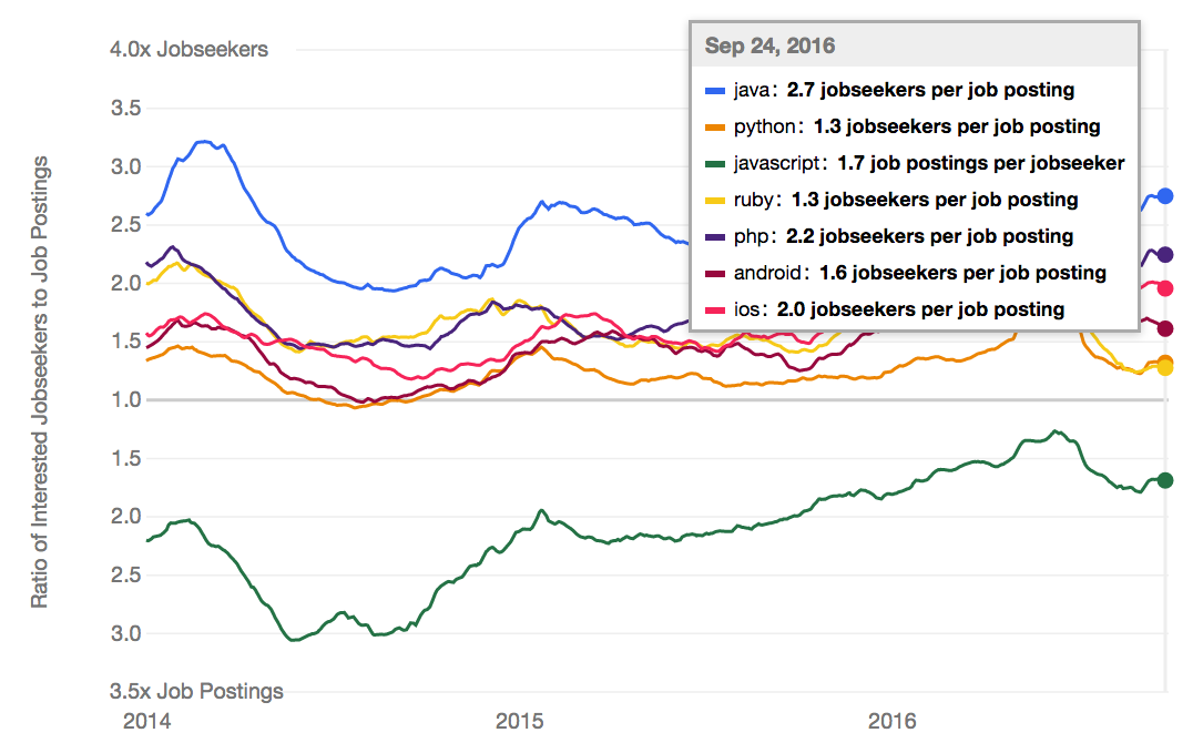 所以就造成了市场上JavaScript开发者供不应求的状况(数据来自Indeed.com)。