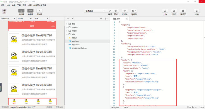 我们找到项目根目录中的配置文件 app.json 加入如下配置信息(app.json文件用来对微信小程序进行全局配置,决定页面文件的路径、窗口表现、设置网络超时时间、设置多 tab 等。)