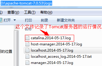 logs文件夹存放Tomcat 的日志文件,打开logs文件夹,可以看到里面的log文件,其中有一个以"catalina.yyyy-MM-dd.log"形式命名的log文件,例如"catalina.2014-05-17.log"日志文件就是记录Tomcat服务器2014-05-17这一天的运行情况。