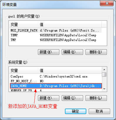 点击系统变量下面的“【新建】”,弹出一个新建系统变量对话框,首先在变量名写上JAVA_HOME,顾名思义,JAVA_HOME的含义就是JDK的安装路径,,然后在变量值写JDK的安装路径,如这里设置的变量值是"D:\Program Files (x86)\Java\jdk1.7.0",设置好变量值之后,点击【确定】按钮,JAVA_HOME环境变量就设置完成,如下图所示:系统变量中多了一个"JAVA_HOME"变量。