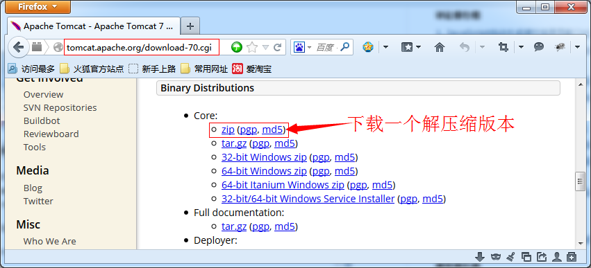 下载Tomcat安装程序包:http://tomcat.apache.org/