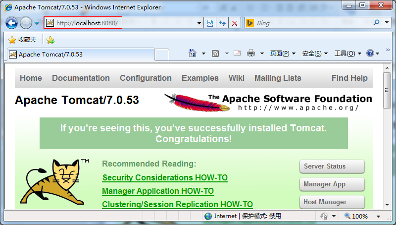 打开浏览器,输入http://localhost:8080/,能显示如下界面代表安装成功。