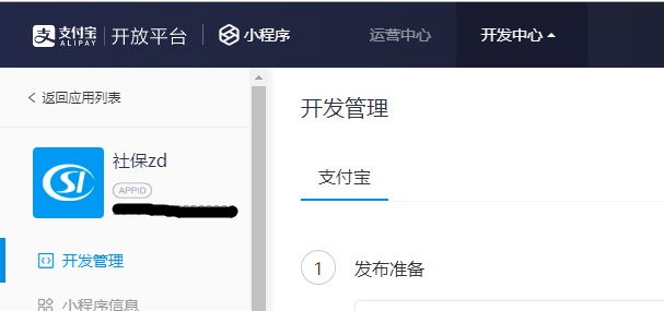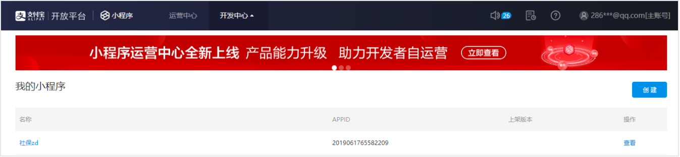 在支付宝小程序应用列表页面点击查看按钮,进入小程序应用页面开始开发配置。