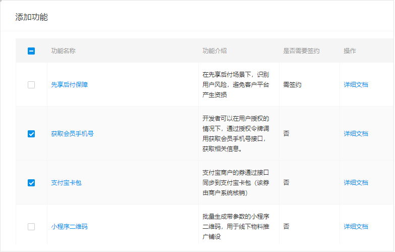 注:根据小程序功能需求,点击添加功能按钮添加功能。如下图所示;