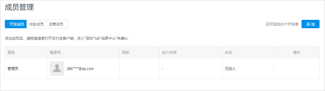 开发者——添加成员后,请被邀请者打开支付宝客户端,进入“朋友”tab“消息中心”来确认。