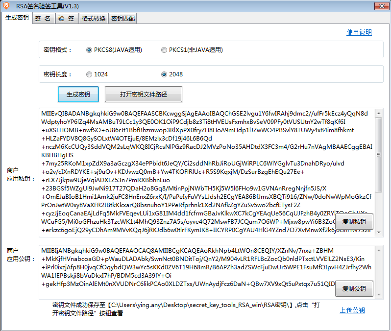 支付宝提供一键生成工具便于开发者生成一对RSA密钥,可通过下方链接下载密钥生成工具: