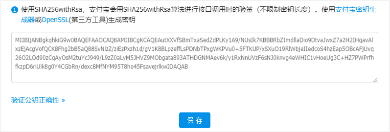 d把签名验签工具里公钥的内容复制到此处,点击保存完成密钥设置