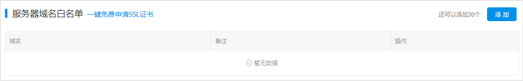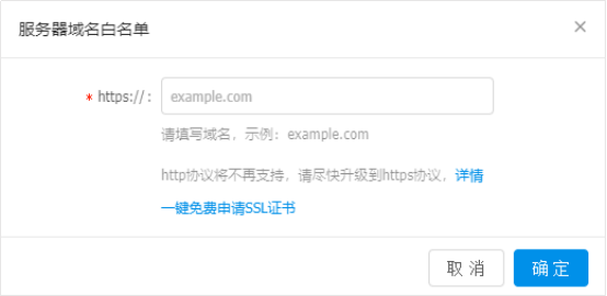进入小程序详情页>开发设置>服务器域名白名单,点击添加按钮进入服务器域名添加页面,填写已经过SSL认证的域名,点击确定按钮即可。