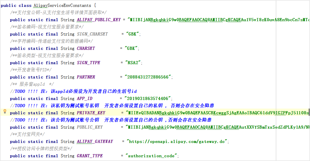 AlipayClient alipayClient = new DefaultAlipayClient("https://openapi.alipay.com/gateway.do", APP_ID, APP_PRIVATE_KEY, "json", CHARSET, ALIPAY_PUBLIC_KEY, "RSA2");注: