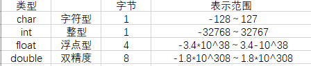 基本数据类型有char(字符型)、 int(整型)、 float(浮点型) 、double(双精度型)