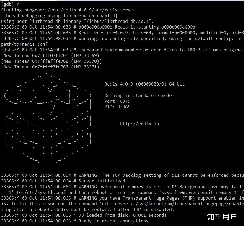 在大致了解了 redis 有哪些代码模块以后,我们把代码拷贝到 linux 平台,然后编译并使用 gdb 调试器跑起来。如下图所示:
