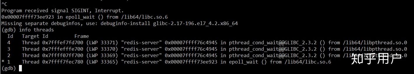 然后使用按 ctrl + C 将gdb中断下来,输入info threads查看当前程序的所有线程: