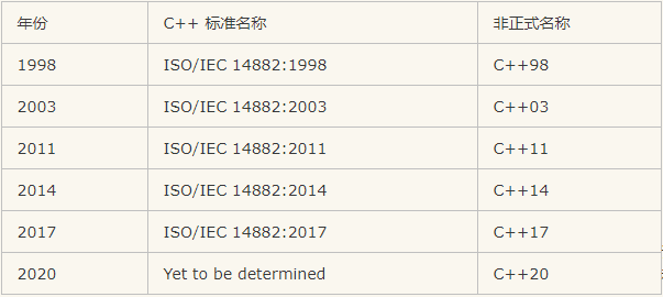 C++仍在不断的发展,下一个版本将是C++20,C++历史上的标准变更如下。