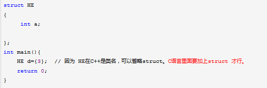 而在C++里面实际上数据类型为HE(主要是因为结构体被当成类对待了),所以定义变量不需要 struct.