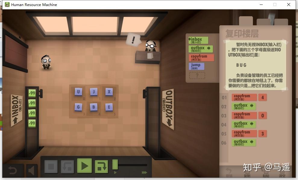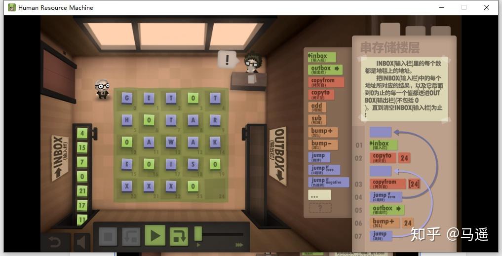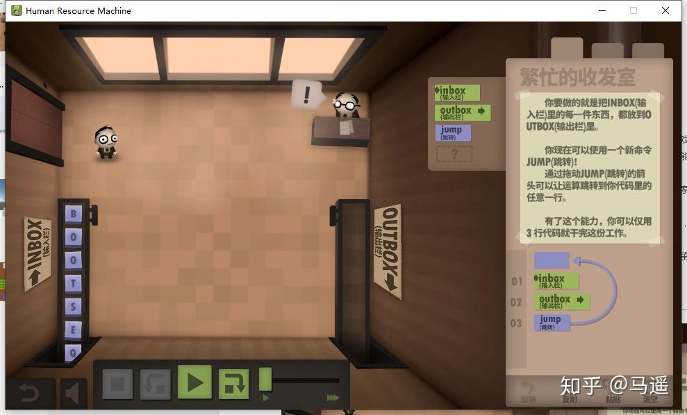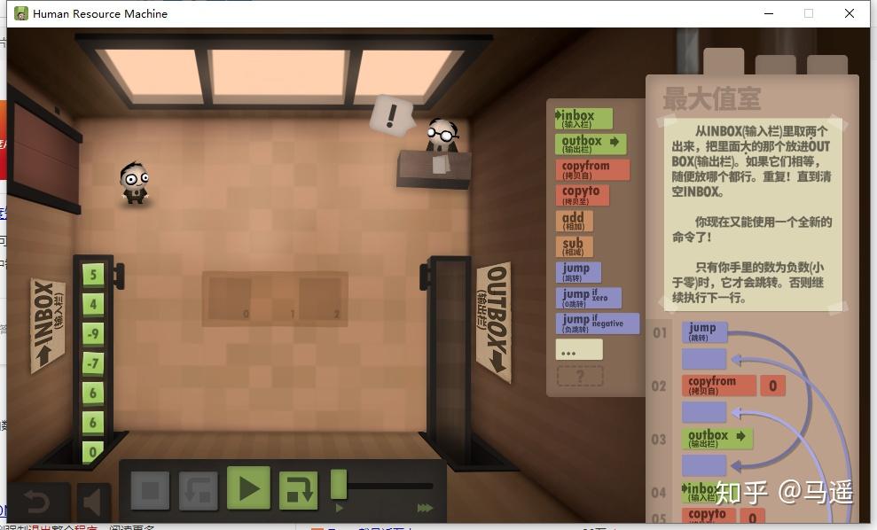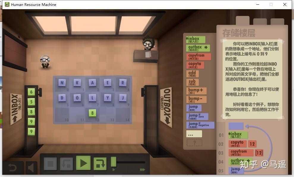 inbox可以用来从输入栏(左边的传送带)拿出一个方块。outbox可以将手上的方块放在输出栏(右边的传送带)上。jump可以让程序跳转到任意一个位置。思路就是取一个、放一个、然后回到第一步无限循环。等价的C语言代码: