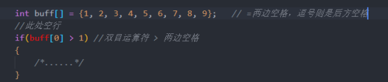 4.对于双目运算符来说,其两边各加上一个空格,而单目运算符则不需要,对于逗号是在其后方加上一个空格。在不同作用的代码段之间空行,不至于让代码都挤在一起。