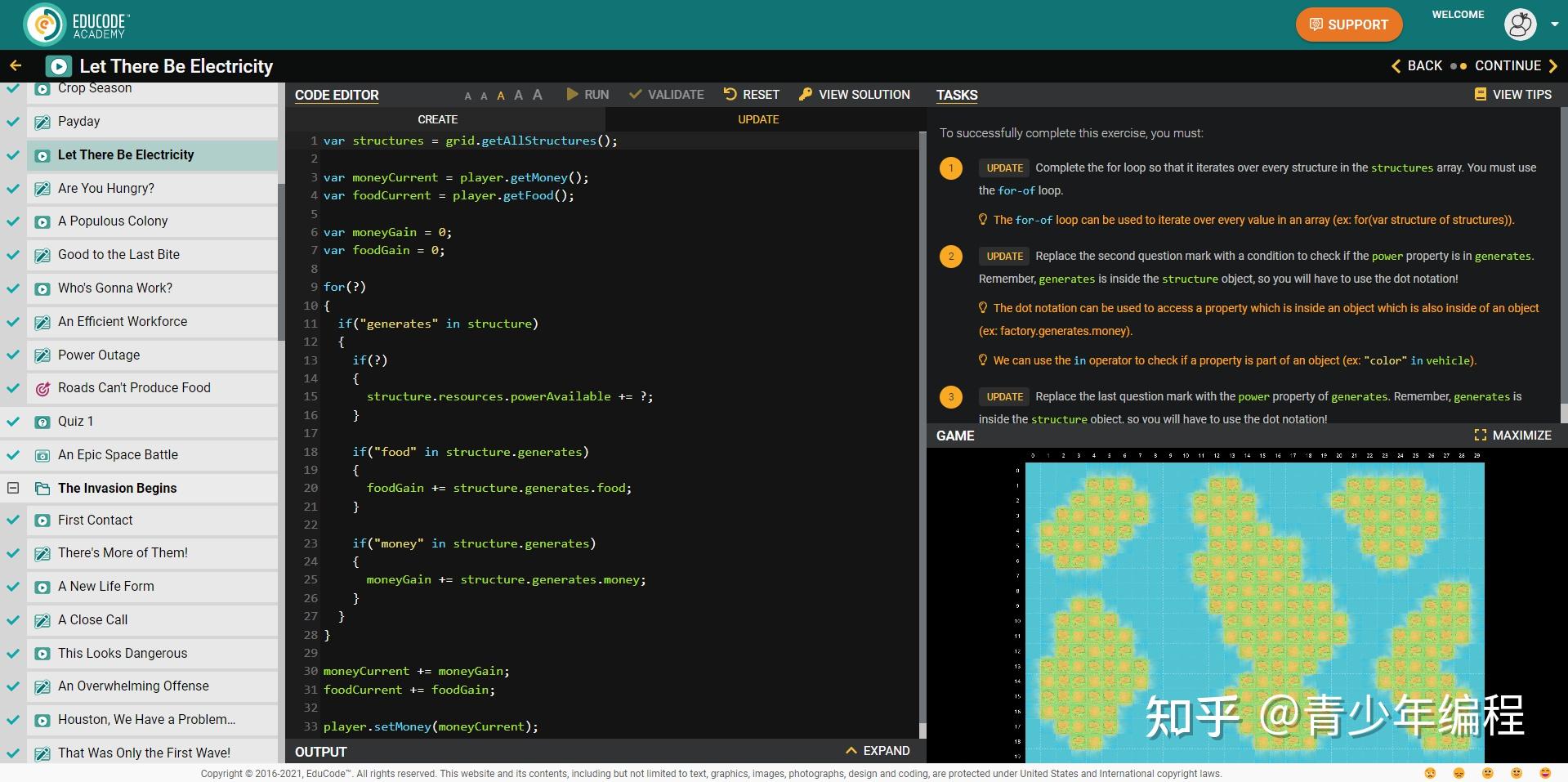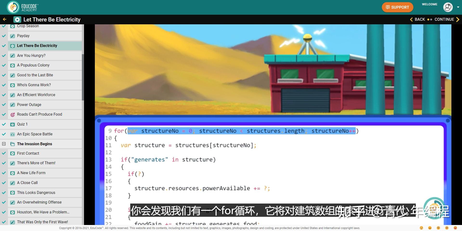 Code.org编程环境示意在需要实际写代码的文本化编程语言课程方面,作者推荐大家尝试一下EduCode Academy(https://educode.org)的课程。在这里学生可以学习如何使用JavaScript、HTML/CSS、Python语言进行编程,学习编程基础、游戏开发、网络开发、数据科学等方面的课程。EduCode Academy的课程适合小学高年龄段以上的学生学习,它提供了很多讲解视频,学生可以通过观看动画视频学习相关的知识点,它还包含了AI检测功能,在学生代码出错时能够自动提供帮助。下图是学生通过观看动画视频学习编程知识的示意。