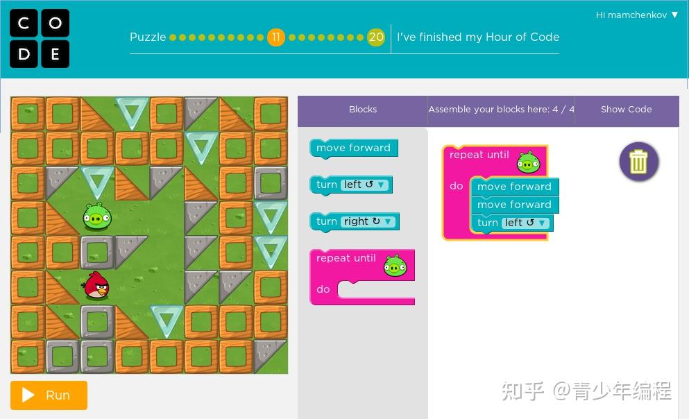 Code.org在面向低年龄段初学者的图形化编程语言课程方面,作者推荐这个网站:http://Code.org(https://code.org)。这是一个非盈利性组织,它的目标是进行计算机科学教育的普及。它的捐助者包括了Microsoft、Google、Disney、Amazon等大量行业巨头,因此它的课程制作的十分精良、水准十分高,而且它还支持中文,对于低年龄段初学者来说十分友好的。作者在孩子一年级时就带孩子学习过它的课程,孩子还是可以接受的。虽然它提供了Course A到Course F等一系列课程供学生学习,但是这些课程都是基于图形化编程语言的,并不适合高年龄段学生,而且它的学习必须要在专业教师的指导下完成,在课程内并没有对于知识点的详细讲解。它的操作界面如下图所示。