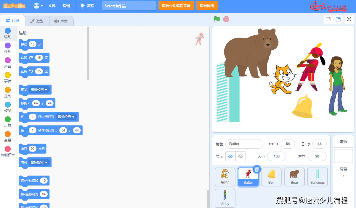 孩子使用Scratch时,点击单个代码块,就能看到“移动”、“转向”、“切换造型”等代码效果;通过做一些简单的操作就能完成几个小故事、节日贺卡、动作游戏类的作品。