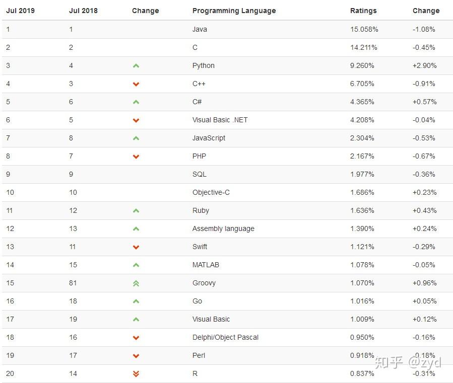 来自2019年7月tiobe世界编程语言排行榜从这里能看到位居前几名是最流行的几种编程语句:Java、C、C++、Python、C#、JavaScript等。