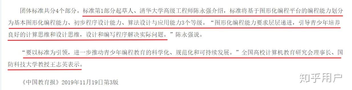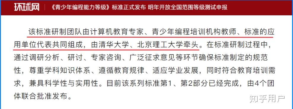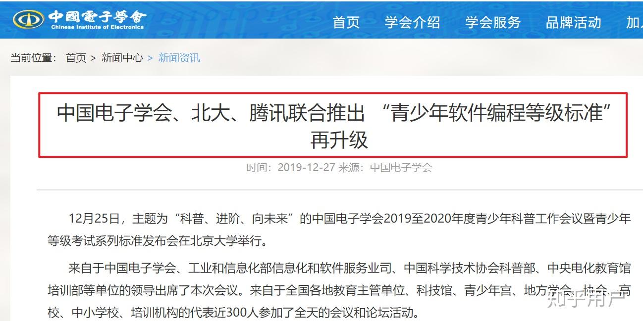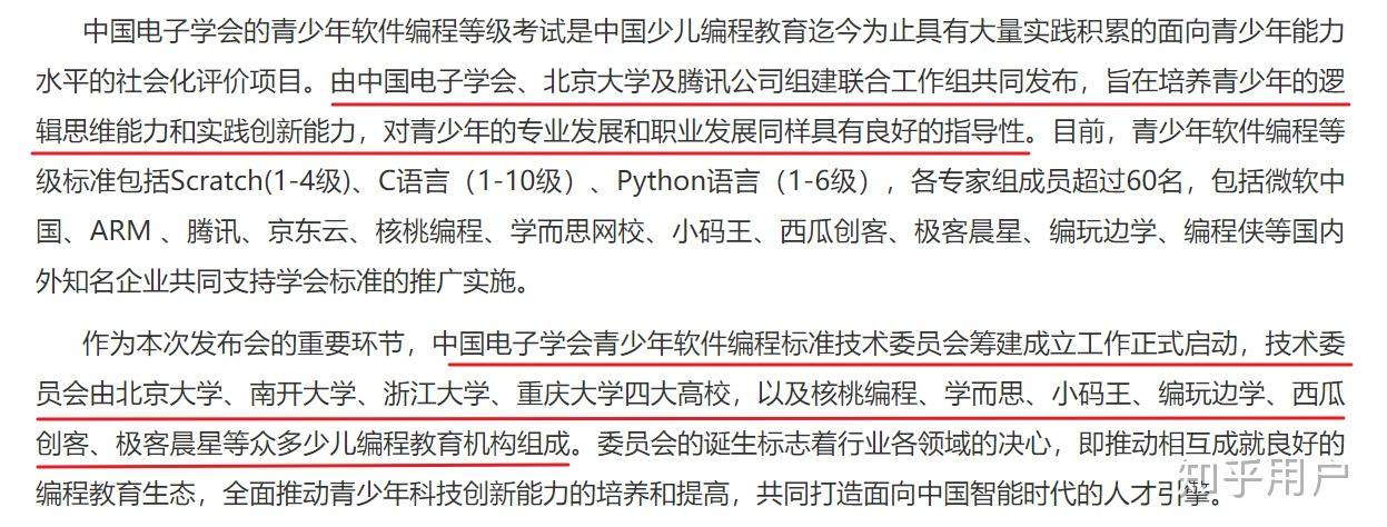 “19年12月,中国电子学会对《青少年软件编程等级标准》内容进行了升级。其核心起草单位由中国电子学会、北京大学、腾讯组成。” “中国电子学会还将筹建青少年软件编程标准技术委员会,由北京大学、南开大学、浙江大学、重庆大学四大高校,以及核桃编程、学而思、小码王、编玩边学、西瓜创客、极客晨星等众多少儿编程教育机构组成。”