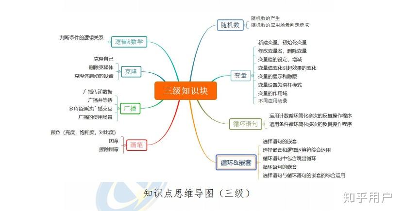 同样以图形化三级为例,电子学会《青少年软件编程等级标准》中将核心知识点以脑图的方式列出,视觉上逻辑非常清晰,对特定编程技能知识点考核的列出也有利于考生对应进行学习巩固。