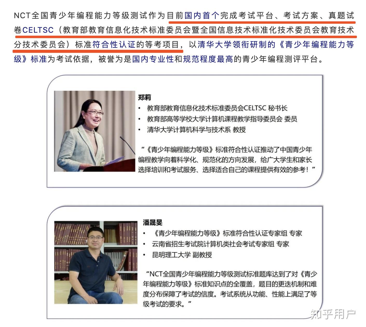 目前基于CELTSC《青少年编程能力等级》标准推出的考试项目有两个,一个是NCT全国青少年编程能力等级测试(https://www.ncctest.cn/),一个是CPA青少年编程能力等级测评(https://www.cpatest.cn/)。