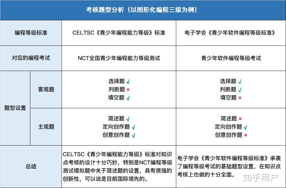 总的来说,CELTSC《青少年编程能力等级》标准对知识点考核的设计十分巧妙,特别是NCT编程等级测试样题中关于简述题的设置,具有很强的创新性,可以说是目前国际领先的。电子学会《青少年软件编程等级标准》承袭了编程等级考试的基础题型设置,在知识点考核上也做的十分全面。