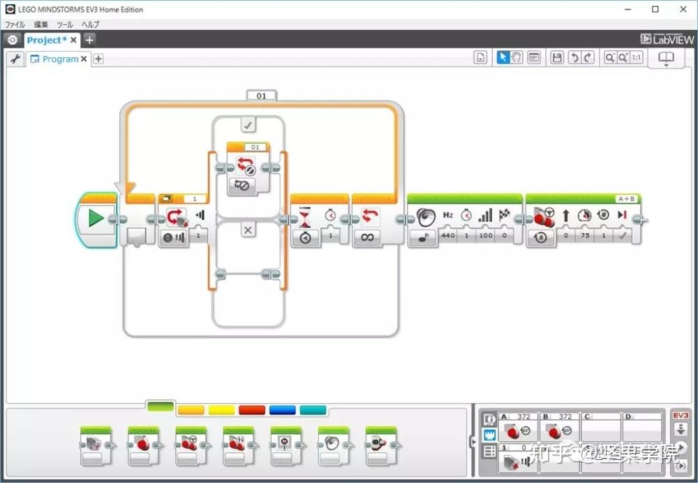 而下面这张图是我教憨憨的LEGO EV3编程界面,也是拖拽式的!