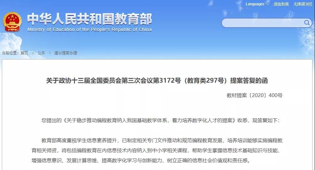 从教育部日前发布的消息《根据需要将编程教育纳入中小学相关课程》中可以看出:编程课程和语文、数学、英语同样重要。