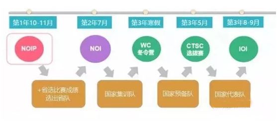 由于获得大学保送只有高一、高二才有机会,因此在初中阶段一定要参加NOIP普及组并尽早参与到提高组比赛,以积累实战经验,如果初中阶段竞赛获奖,也有助于进入重点高中。另外,有一些省份是允许初中生同年同时参加普及组和提高组比赛。下图是准备信息学奥赛的时间节奏: