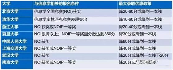信息学奥赛当前最突出的现状为:由于信息学不是中学阶段的关键学科,家长的认知率仍然不高,有些家长甚至都没有听说过。所以竞赛参与人数相对少,且获奖比例较高,因此竞争相对不激烈。另外,信息学奥赛还有“比赛多、机会多”的特点,只要有一次考得好,就有机会获得高校“直接录取”、“降一本线录取”、“降分录取”等相关优惠政策。下面是八大名校在信息学奥赛方面的自招优惠政策。