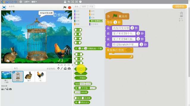 举个例子,有孩子用编程软件Scratch解决奥数题“鸡兔同笼”,他需要现在大脑里把这个过程演绎一下: