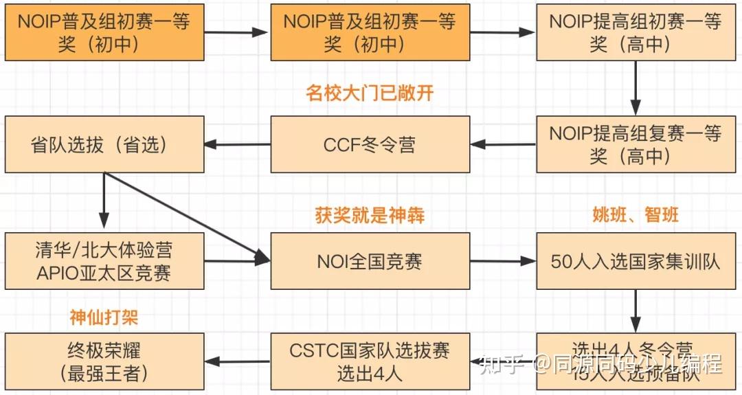 之前一个信息竞赛大牛的成长道路如下,先打NOIP省赛普及组,然后是提高组,拿到一等奖的话,名牌大学的大门已经敲开,之后是NOI 国赛,最后就是代表国家参赛的 IOI。