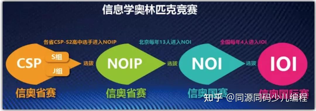 信息学奥赛的关系图:孩子们首先要参加CSP比赛,各省CSP-S2高中选手进入NOIP,NOIP的优秀选手进入NOI,如北京每年有13人选拔进入NOI,NOI优秀选手选拔进入IOI,如全国每年4人进入IOI。