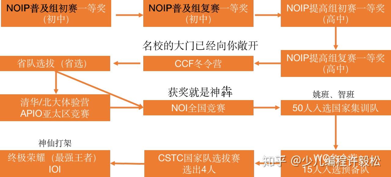 之前一个信息竞赛大牛的成长道路如下,先打NOIP省赛普及组,然后是提高组,拿到一等奖的话,名牌大学的大门已经敲开,之后是NOI 国赛,最后就是代表国家参赛的 IOI。不过这里要提醒所有家长,这条道路虽然很有诱惑,但只适合于极少数对编程有天赋和极高兴趣的孩子,这部分孩子喜欢高强度的逻辑挑战,对钻研问题孜孜不倦,这部分比例目测不超过 5%,而大多数孩子都不适合走这条路。所以,如果孩子对 C++ 没有表现出特别的兴趣,让孩子接触 Scratch 和 python 就够了,不用勉强孩子。