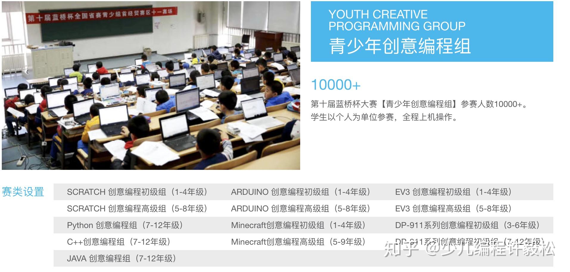 蓝桥杯由工信部人才交流中心举办,始于2010年,主要是做大学生软件比赛的,在大学生群体中有不错的知名度,到目前已经举办了十届。后来少儿编程发展起来后,从第八届蓝桥杯开始,加入了青少年创意编程组(面向6-18岁青少年)的赛项。蓝桥杯应该是少儿编程各种主题涉及最多的比赛了,有scratch、Arduino、乐高ev3、Minecraft这样偏图形化的编程,也有python、c++、java这样的代码语言的赛项。蓝桥杯的题目会有点难度,比赛相对比较硬核,同时它是第三方机构举办,所以公信力也不错。