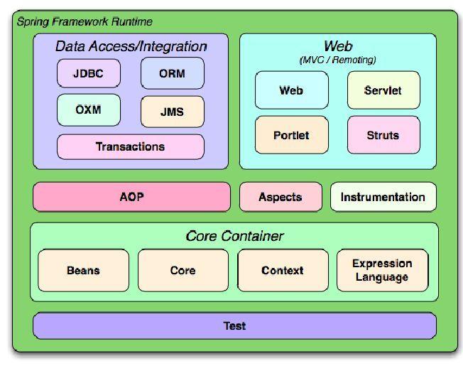 Spring 对JavaEE开发中非常难用的一些API(JDBC、JavaMail、远程调用等),都提供了封装,使这些API应用难度大大降低Spring 框架是一个分层架构,它饮食一系列的功能要素并被分为大约20个模块。这些模块分为Rore Container、Date Access/Integration、Web、AOP(Aspect Oriented Programming)、Instrumentation和测试部分,如下图所示: