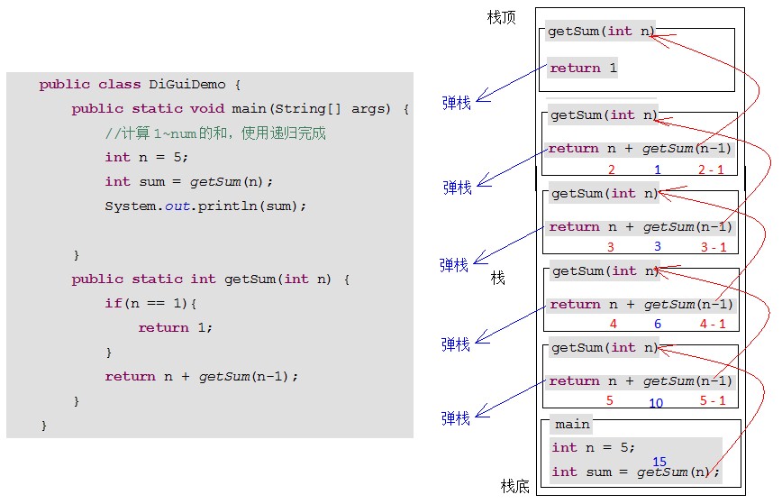 public class DiGuiDemo { public static void main(String[] args) { //计算1~num的和,使用递归完成 int num = 5; // 调用求和的方法 int sum = getSum(num); // 输出结果 System.out.println(sum); } /* 通过递归算法实现. 参数列表:int 返回值类型: int */ public static int getSum(int num) { /* num为1时,方法返回1, 相当于是方法的出口,num总有是1的情况 */ if(num == 1){ return 1; } /* num不为1时,方法返回 num +(num-1)的累和 递归调用getSum方法 */ return num + getSum(num-1); } }代码执行图解