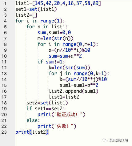 例57:编程验证对任意自然数N, 如果各位数字平方和不是1, 则求平方和的各位数字的平方和, 最后必有145, 42, 20, 4, 16, 37, 58, 89 之无穷循环。