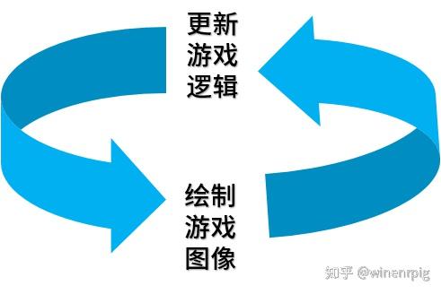 图6 游戏循环示意图在之前的程序中,我们编写了update()函数来改变小球坐标,也编写了draw()函数来绘制小球图像,而这两个函数就恰好分别对应了游戏循环中的两个基本操作:update()函数用来更新游戏逻辑,而draw()函数则用来绘制游戏图像。由于游戏是不断地在运行着的,需要不断地更新游戏逻辑,同时将更新后的内容重新显示出来,因此要将update()函数和draw()函数放入游戏循环中重复执行。程序看起来应该像这样: