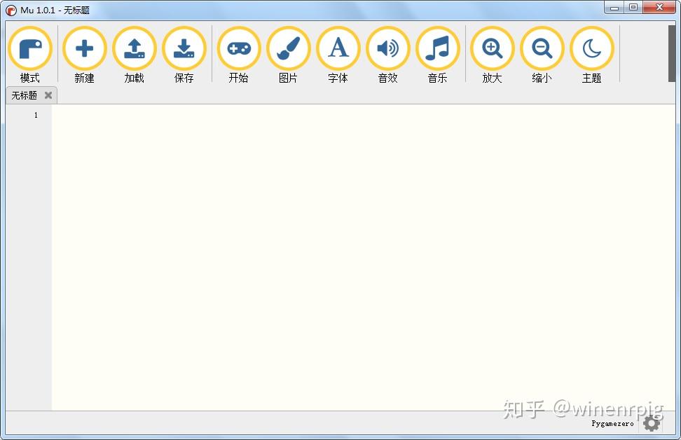 图2 “Pygame Zero”运行模式Mu编辑器中的空白区域便是我们将要编写代码的地方,当程序写好之后,我们单击界面上方的“开始”按钮便可以运行程序了。看起来真是太棒了,还等什么呢?赶快开工吧!