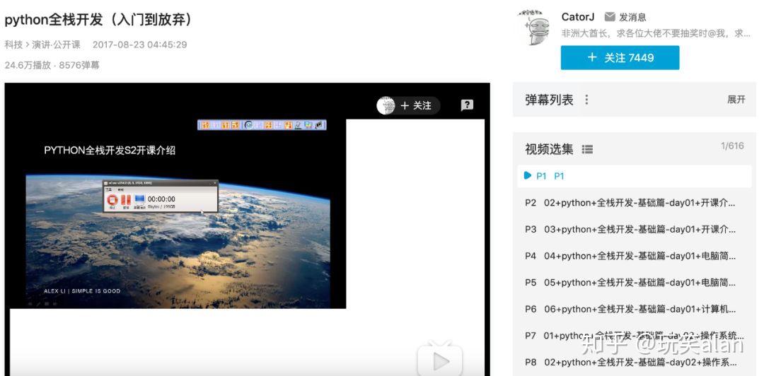 此外,B站上还有一个全栈课程,是我看过且认为讲得比较细的视频课程,也是免费的。我建议你在看完了小甲鱼的课程后再看这套课程。课程内容很多,你并不一定要按顺序观看,也不用全部学完,可以有选择性的看,在小甲鱼讲的知识点上形成补充。