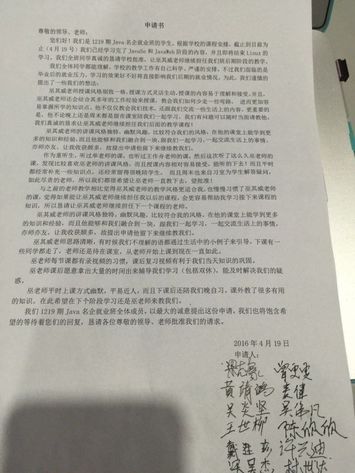 这是学生给我的评价,当时学生准备教第二个阶段,学生准备换老师,因为我经常陪着他们到晚上十点,帮他们解决问题,我当时为什么要这么做,因为他们就像我以前,为了一条出路,我想到了我以前自己在计算机这条路上,走过的艰辛和弯路,我只想让他们少走弯路。就如此而已,包括现在我的教育模式为什么要和学生一起住,就是为了让他们快速的解决问题