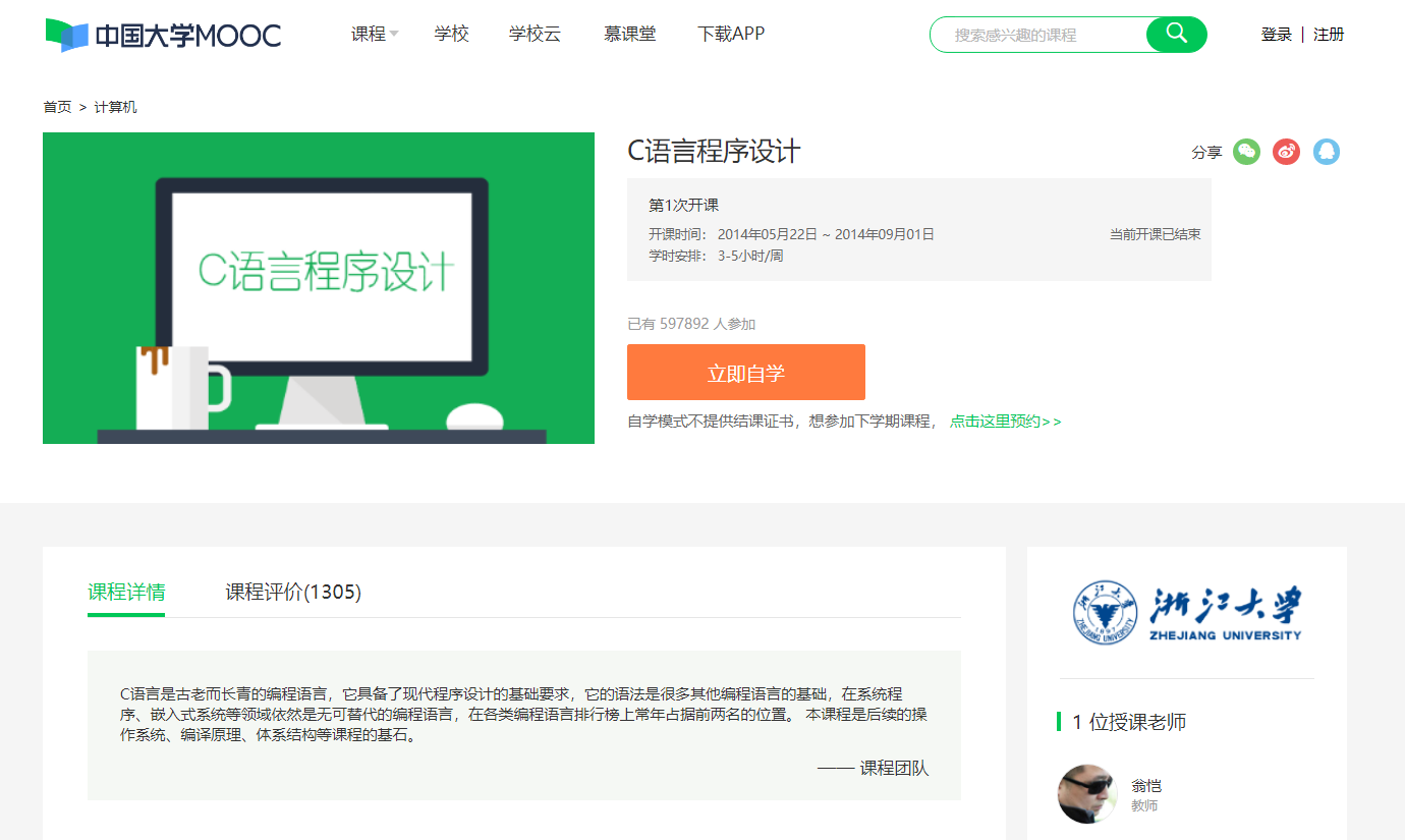 如果你觉得新手看书实在不容易理解,那么猪学长推荐我们浙江大学翁恺教授的免费的c语言入门课程: