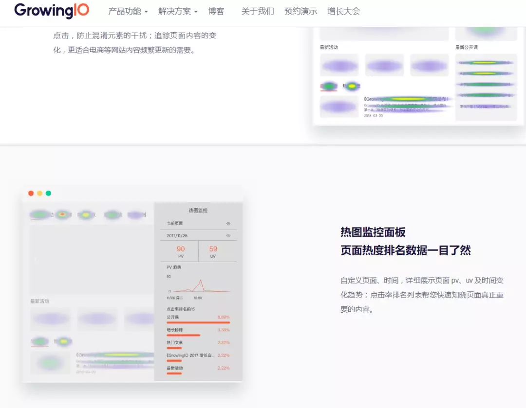 Growing IO是一款无埋点的数据统计工具,主要亮点是在用户转化和留存环节的数据分析功能,能够监听到用户对页面的注意力、点击热力图等,为产品运营提供优化指导。