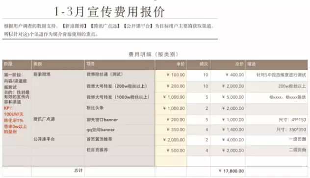 费用预算表是对应以上所有项目的支出的,需要明细到每一项工作的花费,以便财务能够及时调拨营销费用,合理安排预算。