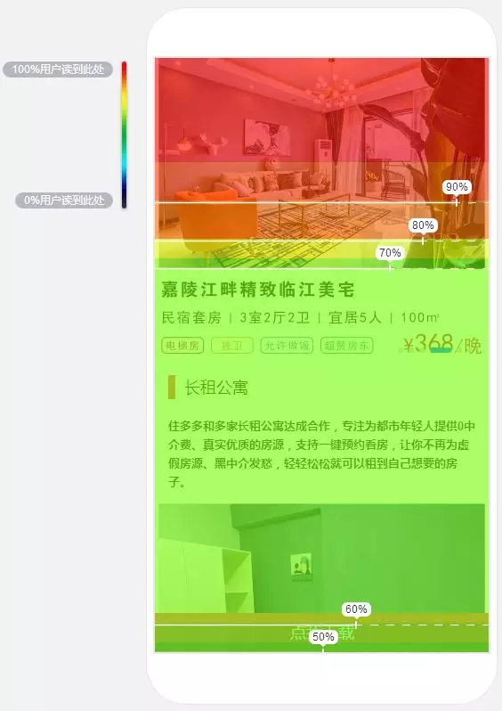 此图示意的是一个落地页的浏览触达图,通过此图我们看到,红色部分表示的是有90%的用户都浏览到了页面的这个位置,而最底部的绿色部分表示,60%的用户浏览到了这个位置,意味着在中途流失了30%的用户。