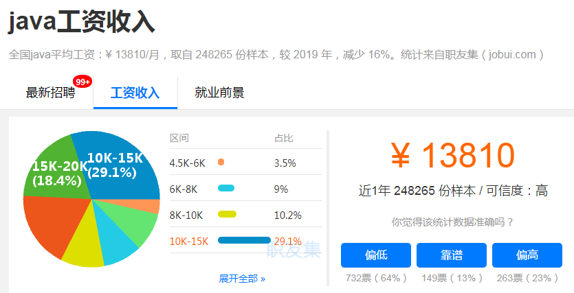 以Java岗位为例,全国平均月薪过万,应届生起薪为6k+。难怪在95后求职意向调查中,程序员成为95后最想pick的岗位。